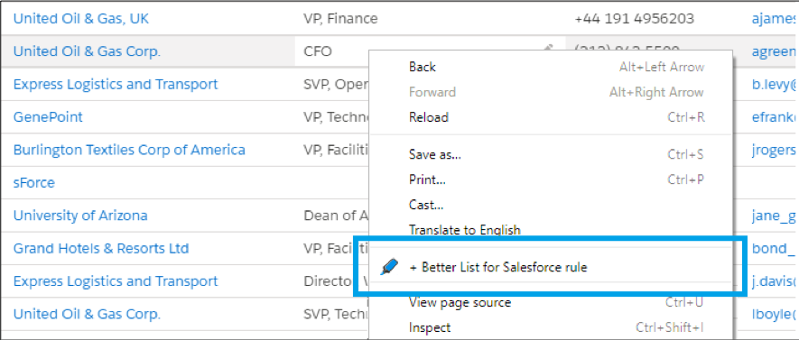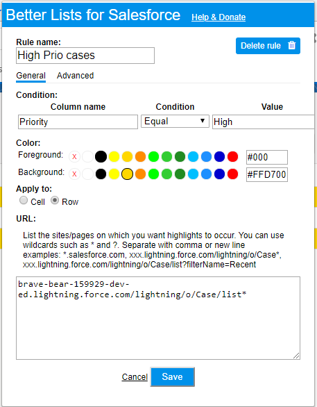 The easiest way to create a rule is to right click a list view cell and click "+ Better Lists for Salesforce rule". This will fill in the condition and url for highlighting.